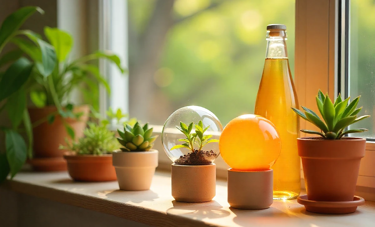 Plant watering spikes and glass globes offer a more aesthetic solution for visible areas of your home. These devices work on the same principle but look more intentional and stylish than plastic bottles.
